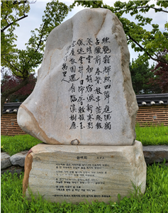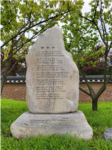주정에서 제일 먼저 보이는 것은 돌에 새겨진 안민영의 ‘매화사’라는 시 전문이다. 잠시 걸음을 멈추고 읽어보니, ‘추위(시련)를 이겨내고 꽃을 피워 봄을 알리는 매화를 예찬한 시로서 매화를 의인화하여 그 아름다운 자태를 노래한 시’라고 적혀 있다. 문득 저자와 시가 궁금해져 검색해 보니, 안민영은 1816년에 태어난 조선시대 서얼 출신의 가객이고, 매화사는 조선 고종 때 지은 시조라고 한다.